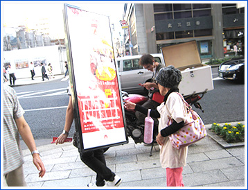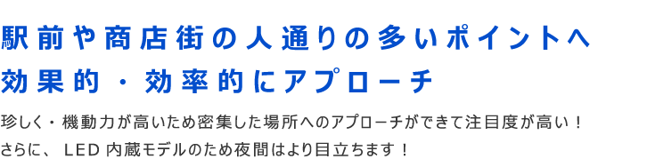 商店街や駅前など人が非常に多いポイントでも自由に入って行くことが可能! そのため、駅前の人が多い時間帯は駅前で、商店街の人が多い時間帯は商店街へ移動というように常に人の多いポイントに移動出来るため、他の動かない屋外広告と比較すると圧倒的なインプレッション数を誇ります!