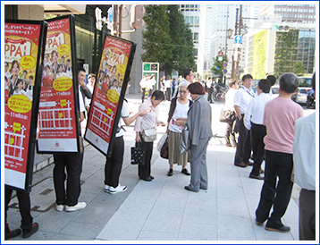 東京駅八重洲口から徒歩10分程の距離にある八重仲ダイニングのキャンペーンを2日間実施させて頂きました。 日本橋駅から八重洲口方面にかけて周遊していると、アドウォークを見たサラリーマンやOLの方からクーポンを下さいと声をかけて頂く事が多々ありました。 実施期間は八重仲ダイニングの方も多くの人で満席になっていました。