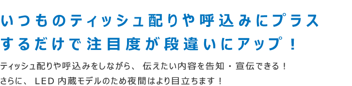 いつもは何を配っているか通行人の方にわかってもらえるように手作りの看板を作成してそれを首からぶら下げながらティッシュを配布していたのですが、壊れやすく使い勝手も悪かったためアドサインのような商品を探していたところ見つけたので試しにレンタルさせていただきました。