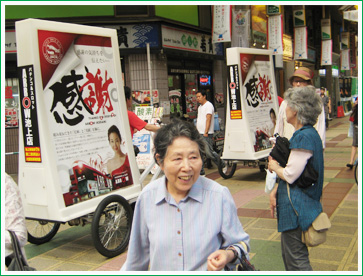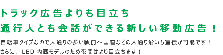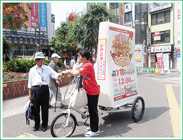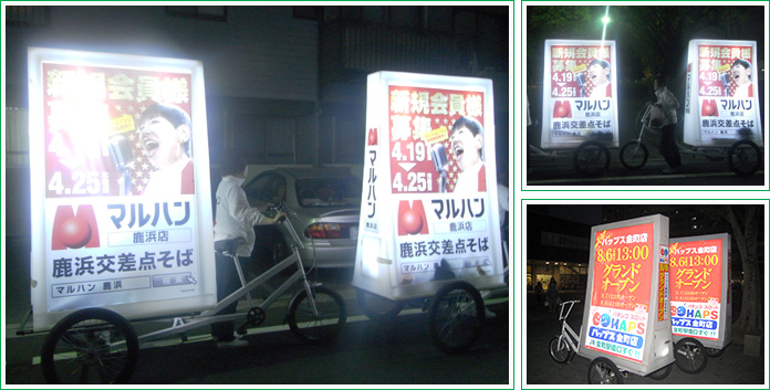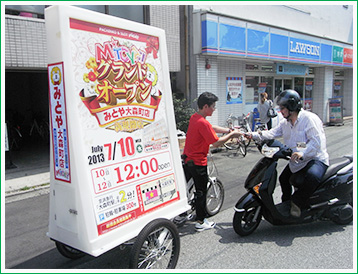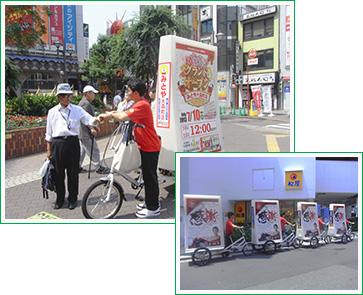 お店の最寄駅ロータリー付近などの人通りがあるところはもちろんの事、自転車タイプなのでとなり駅やアピールしたい地域一帯を人の流れを踏まえてリアルタイムに移動しながら宣伝が可能!