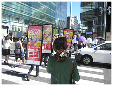 東京駅八重洲口から徒歩10分程の距離にある八重仲ダイニングのキャンペーンを2日間実施させて頂きました。 日本橋駅から八重洲口方面にかけて周遊していると、アドウォークを見たサラリーマンやOLの方からクーポンを下さいと声をかけて頂く事が多々ありました。 実施期間は八重仲ダイニングの方も多くの人で満席になっていました。